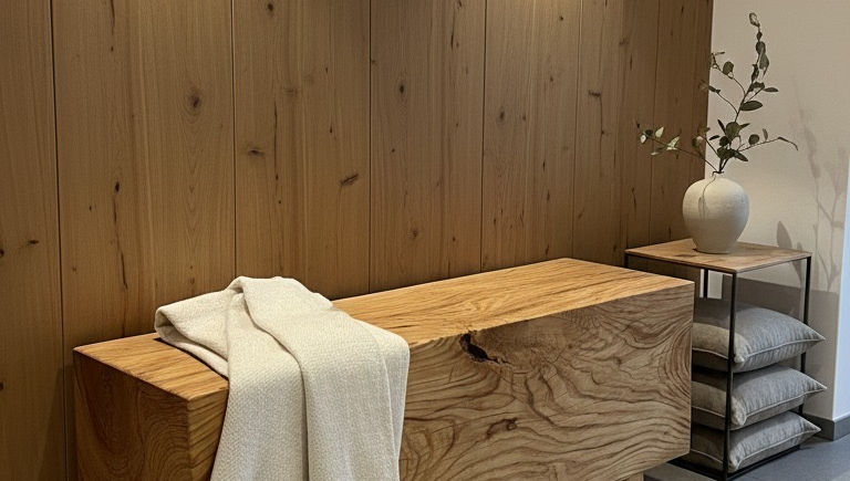 Kombinujeme masivní dřevo a prémiový mumifikovaný mech, který nevyžaduje žádnou výraznou údržbu.